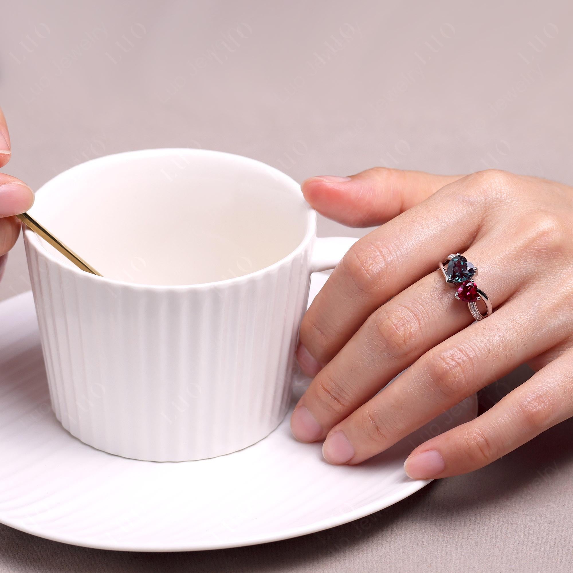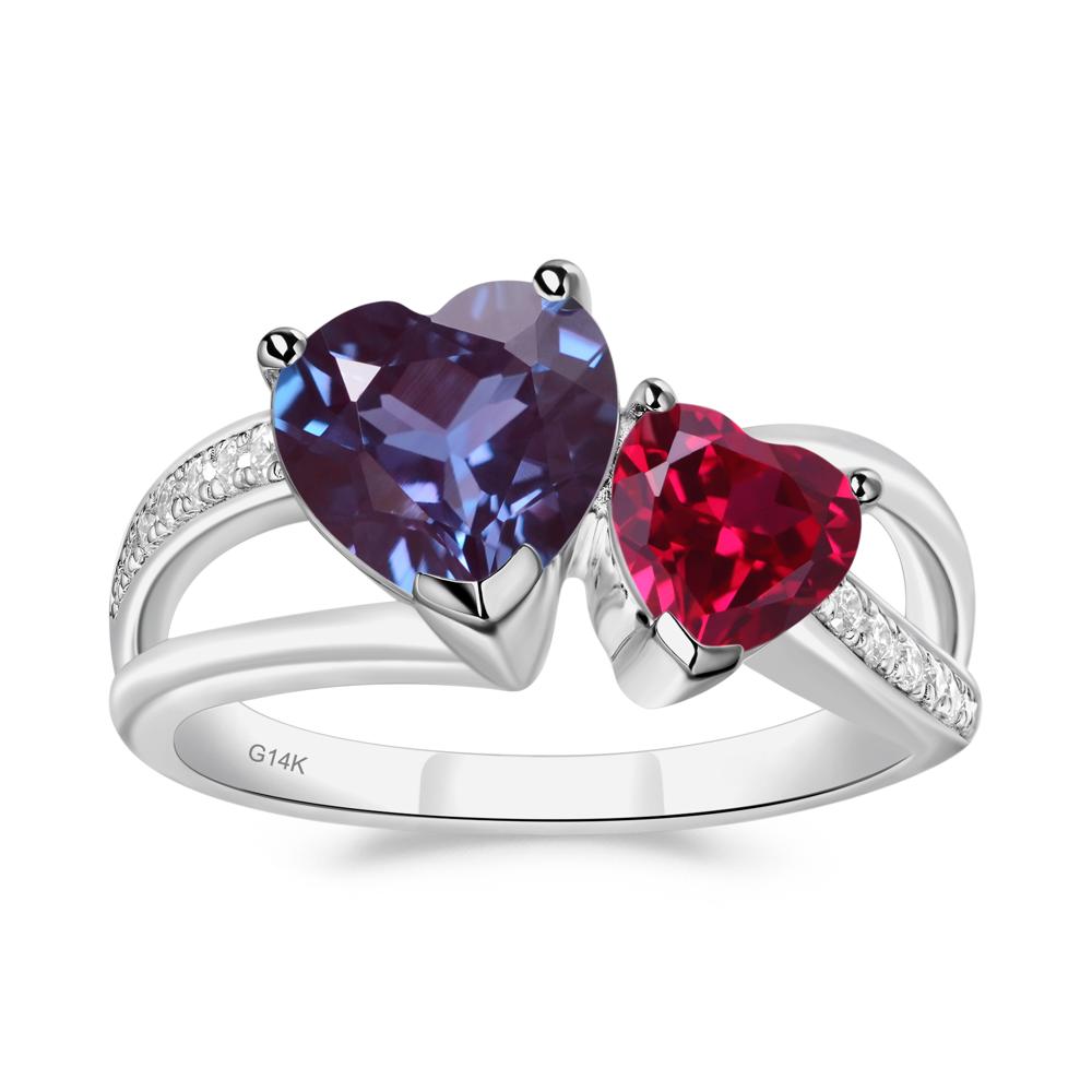 Dieser Ring weist ein einzigartiges, ineinander verschlungenes Design auf, bei dem sich zwei Bänder vereinen, die jeweils in einer herzförmigen Fassung aus Alexandrit und Rubin gipfeln und so eine Symphonie aus Eleganz und von der Liebe inspirierter Symbolik erzeugen.