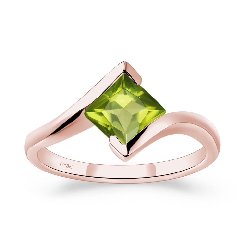 Dieser Ring verfügt über eine innovative Spannfassung, bei der der Peridot im Prinzessschliff scheinbar zwischen den geteilten Enden des Rings schwebt und so eine elegante und moderne Interpretation eines Verlobungsrings bietet.