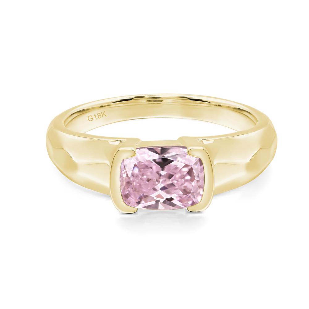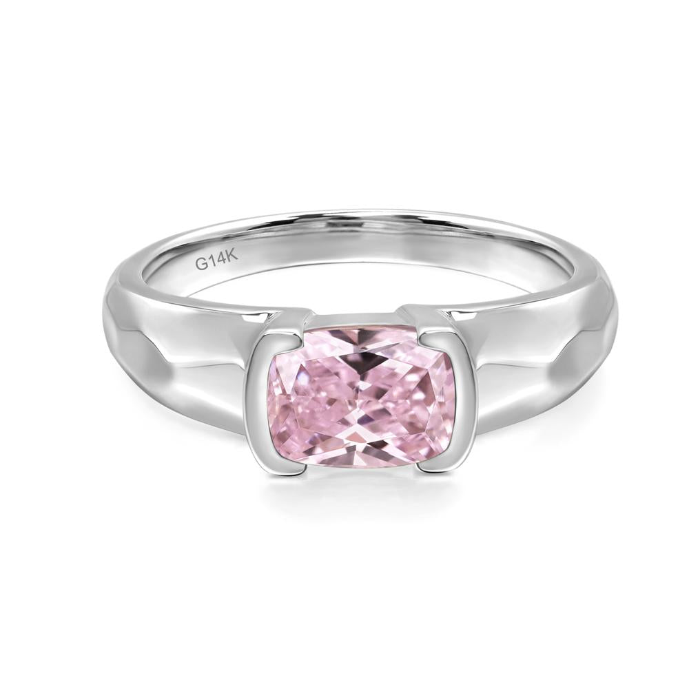 This ring showcases a rectangular cushion cut pink cubic zirconia in a bezel setting, paired with a hammered band, creating a rich texture contrast and an artisanal, contemporary aesthetic.