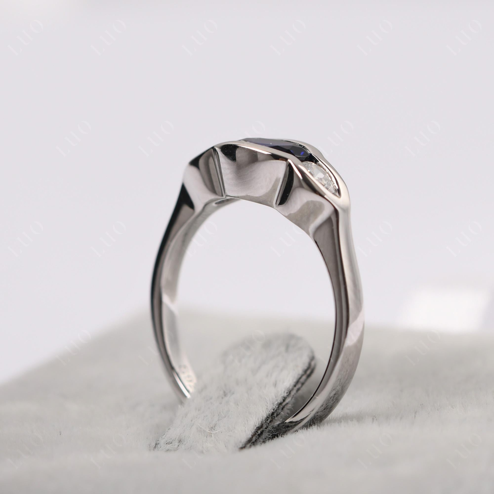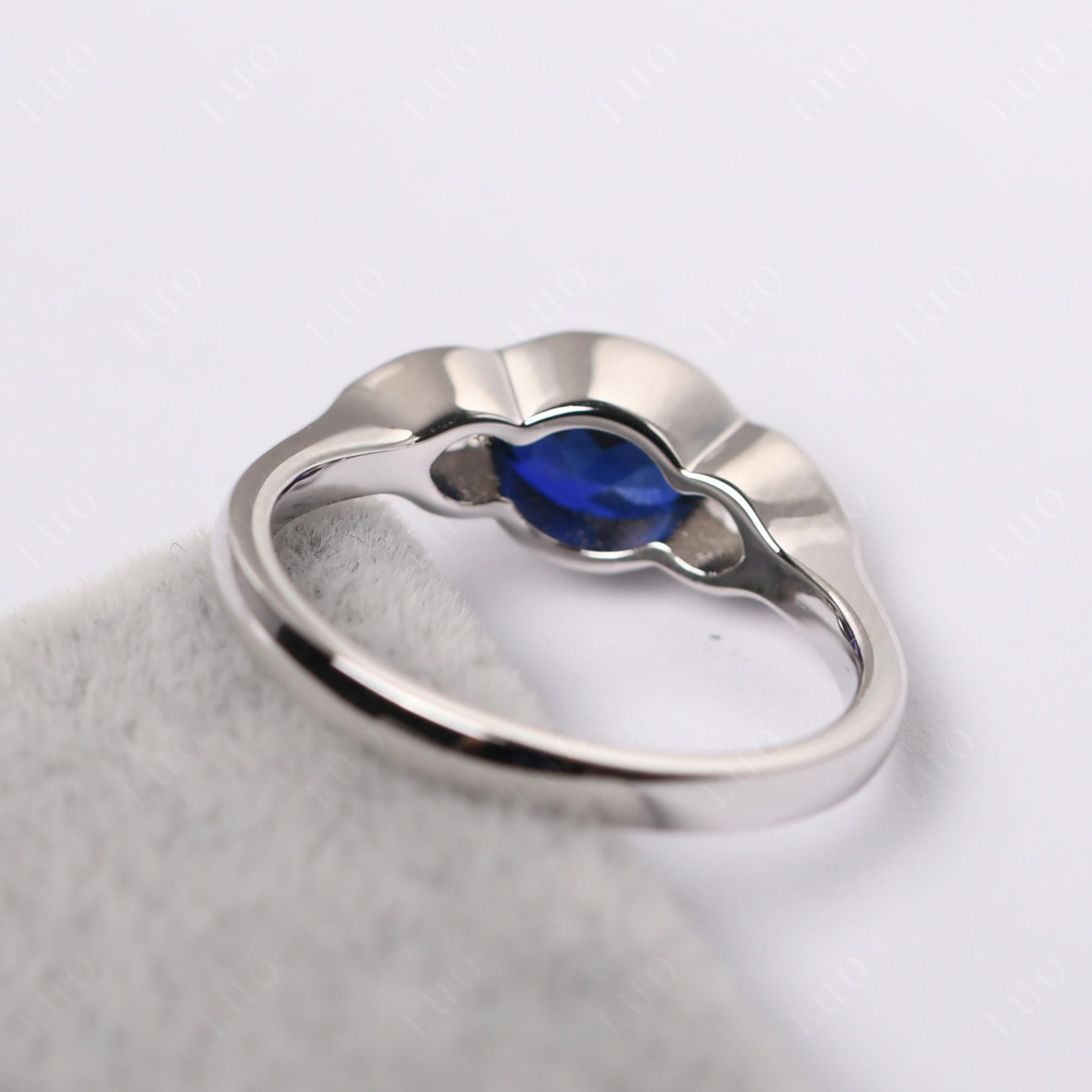 This ring's allure lies in its sleek, fluid design, which cradles a marquise cut lab sapphire at its center. The polished band undulates gracefully, reminiscent of gentle waves, encapsulating a sense of serenity and sophistication.