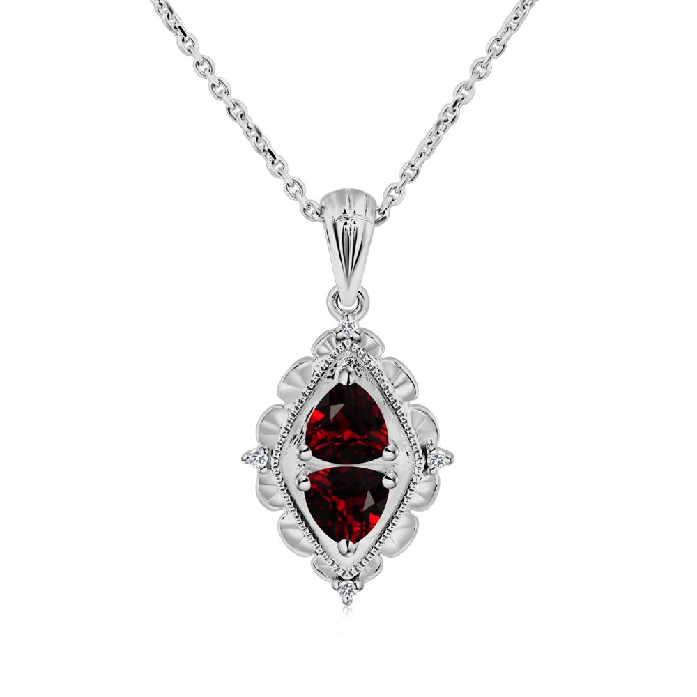 This pendant exudes an antique elegance with its symmetrical, marquise-shaped design, featuring twin trillion cut garnet set within a sector edge frame, adorned with classical bead accents.