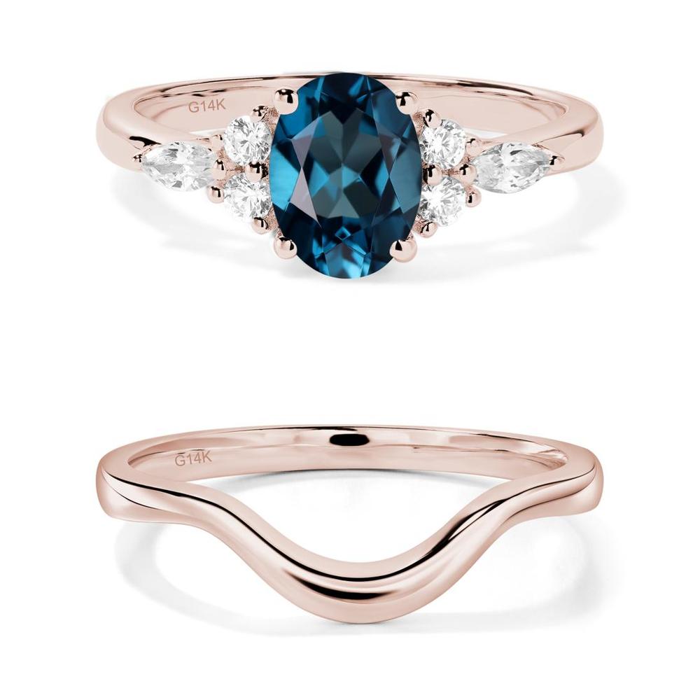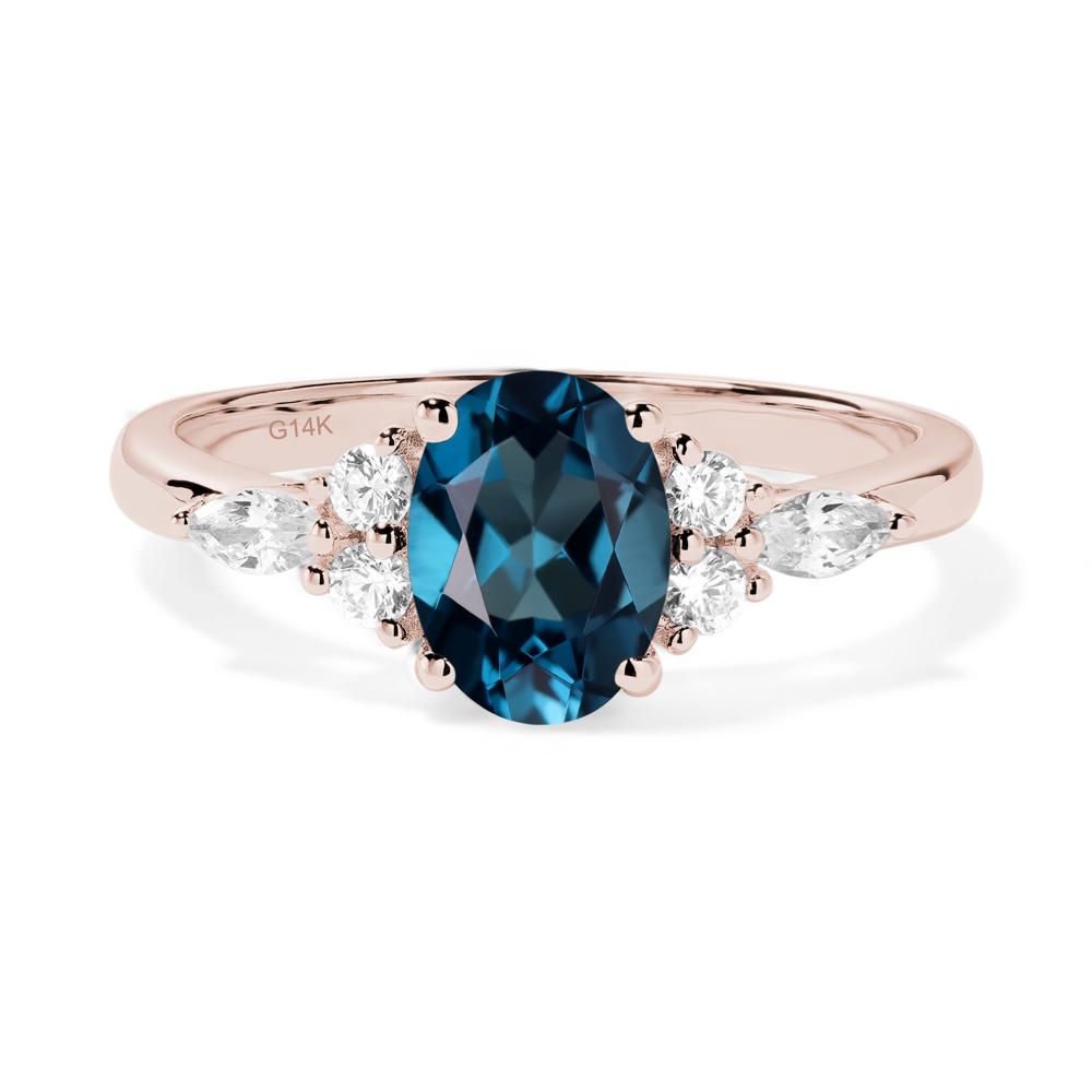 This oval london blue topaz engagement ring features an elegantly faceted gemstone flanked by two marquise stones and four round brilliant stones, all set in a harmonious design. The arrangement creates a dazzling display of light, making it a sophisticated choice for special occasions or as a meaningful gift, reflecting both beauty and timeless elegance.