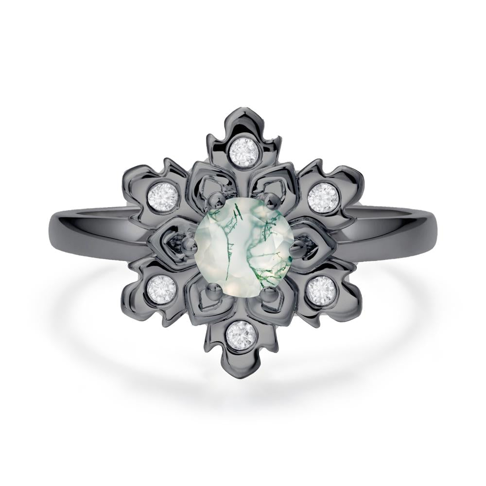 This ring captures a whimsical essence with a snowflake-inspired design, featuring a central moss agate surrounded by radiating petals, creating a vibrant, floral interpretation of a winter motif.