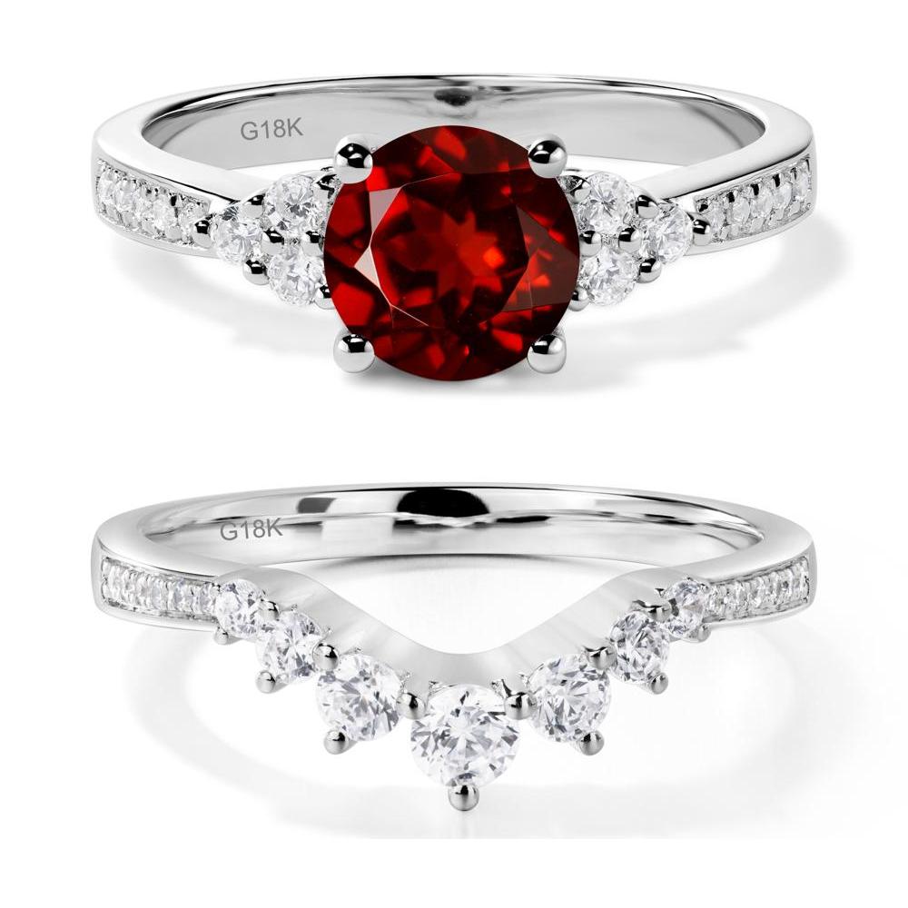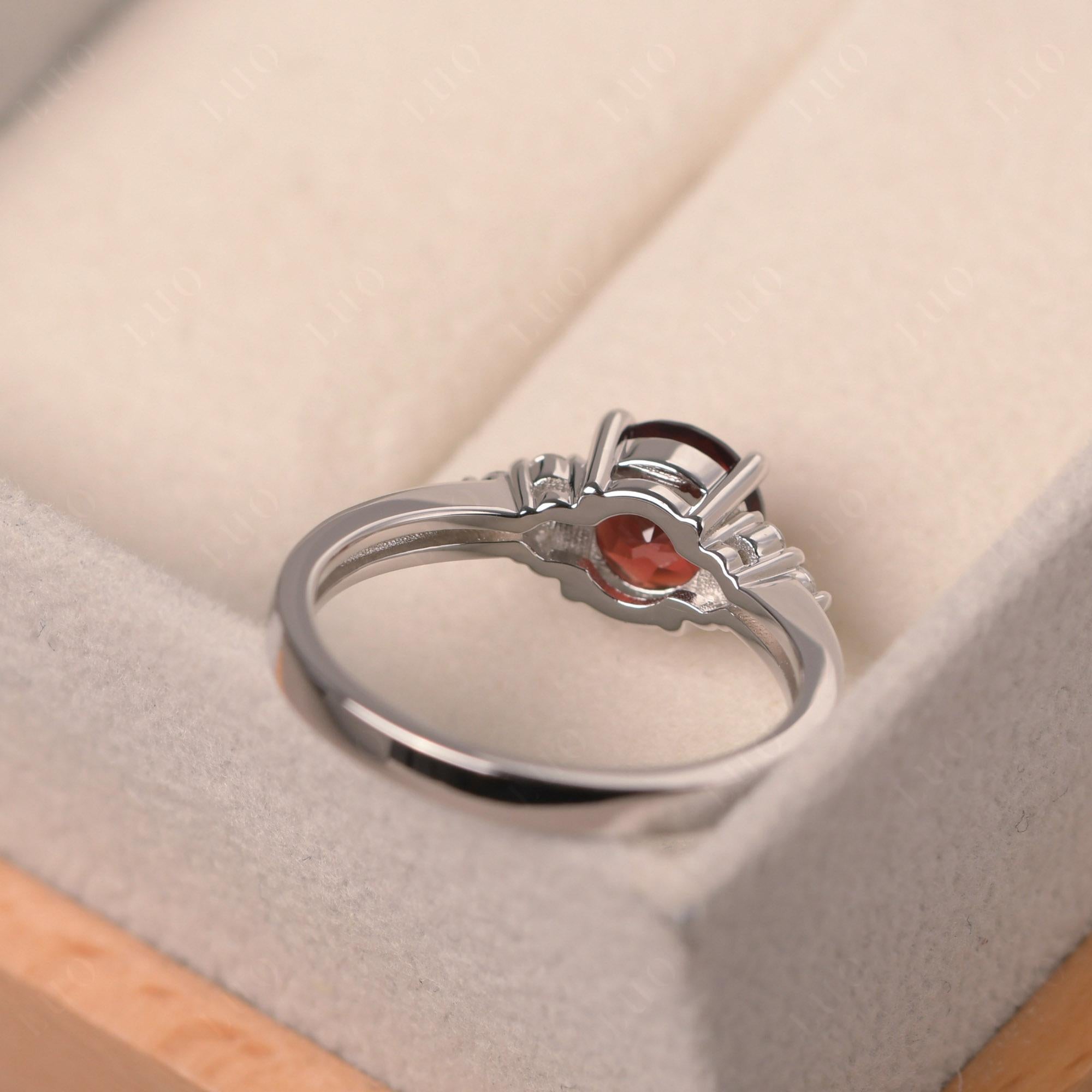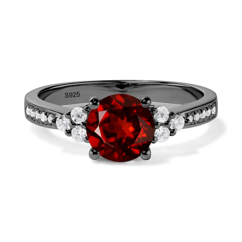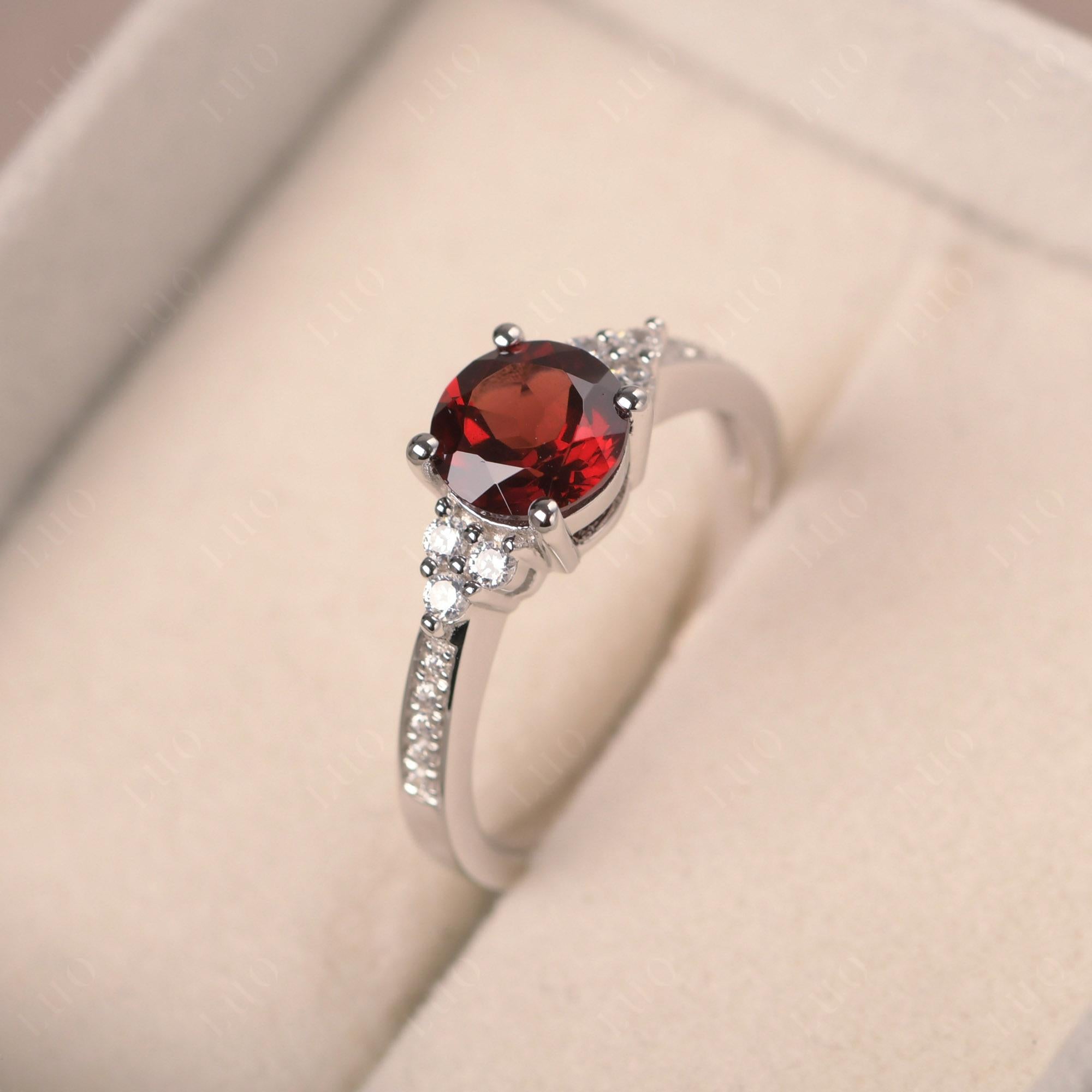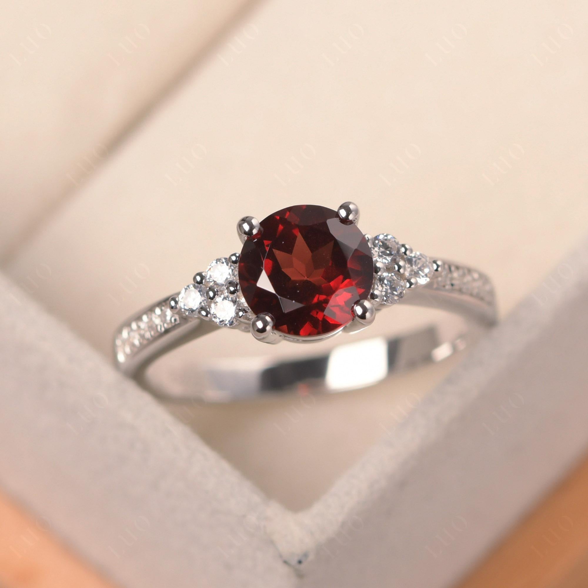 This garnet ring is a classic and simple choice for an engagement, featuring a round gemstone complemented by three smaller gems on each side. Its elegant design embodies timeless beauty, making it a perfect symbol of commitment and love.