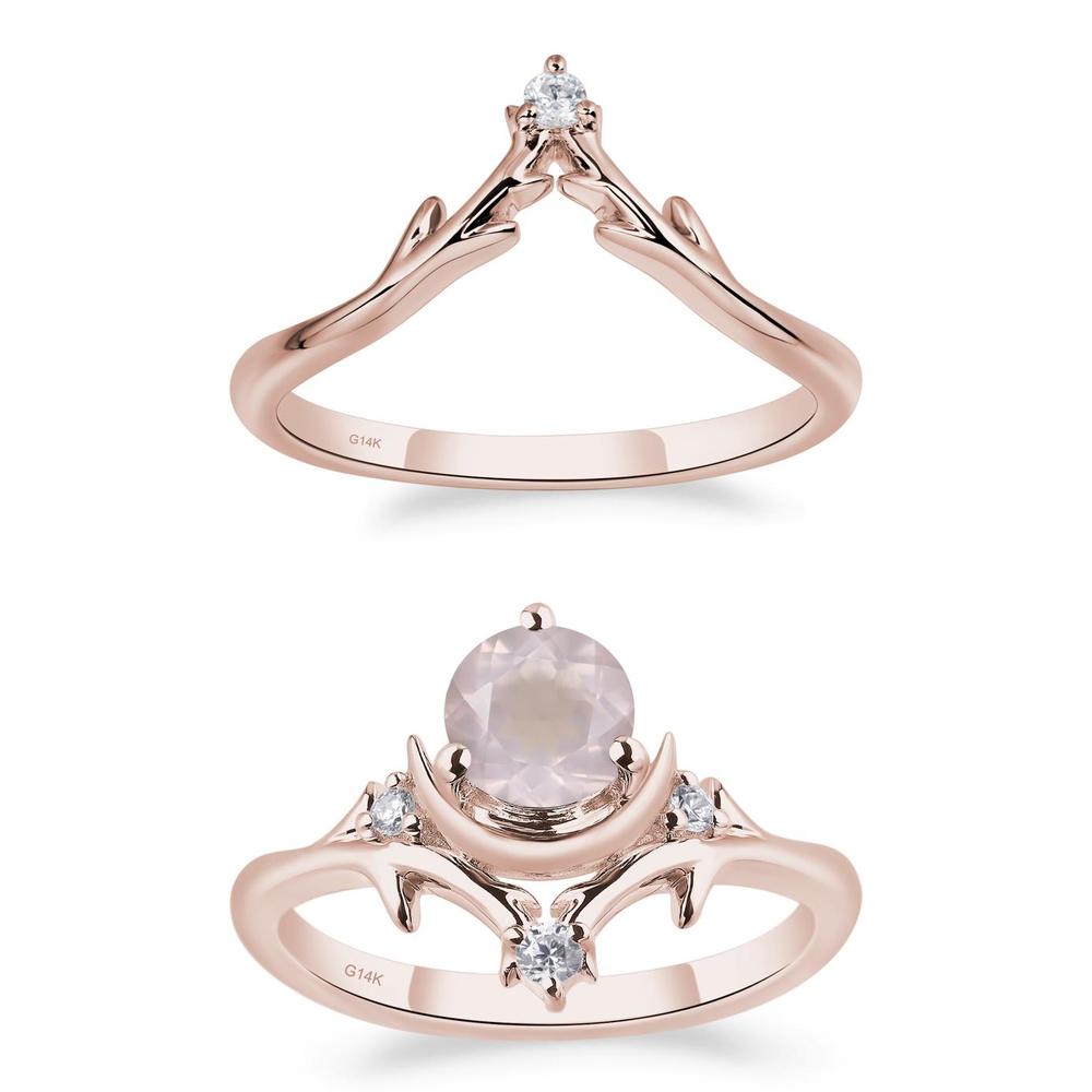 Questo anello integra ad arte un elemento a mezzaluna, abbracciando un prominente quarzo rosa centrale con la sua forma curva, completato da una cascata di sfere e bande fluide per un motivo etereo ispirato alla luna, il tuo amore per la luna e ritorno.