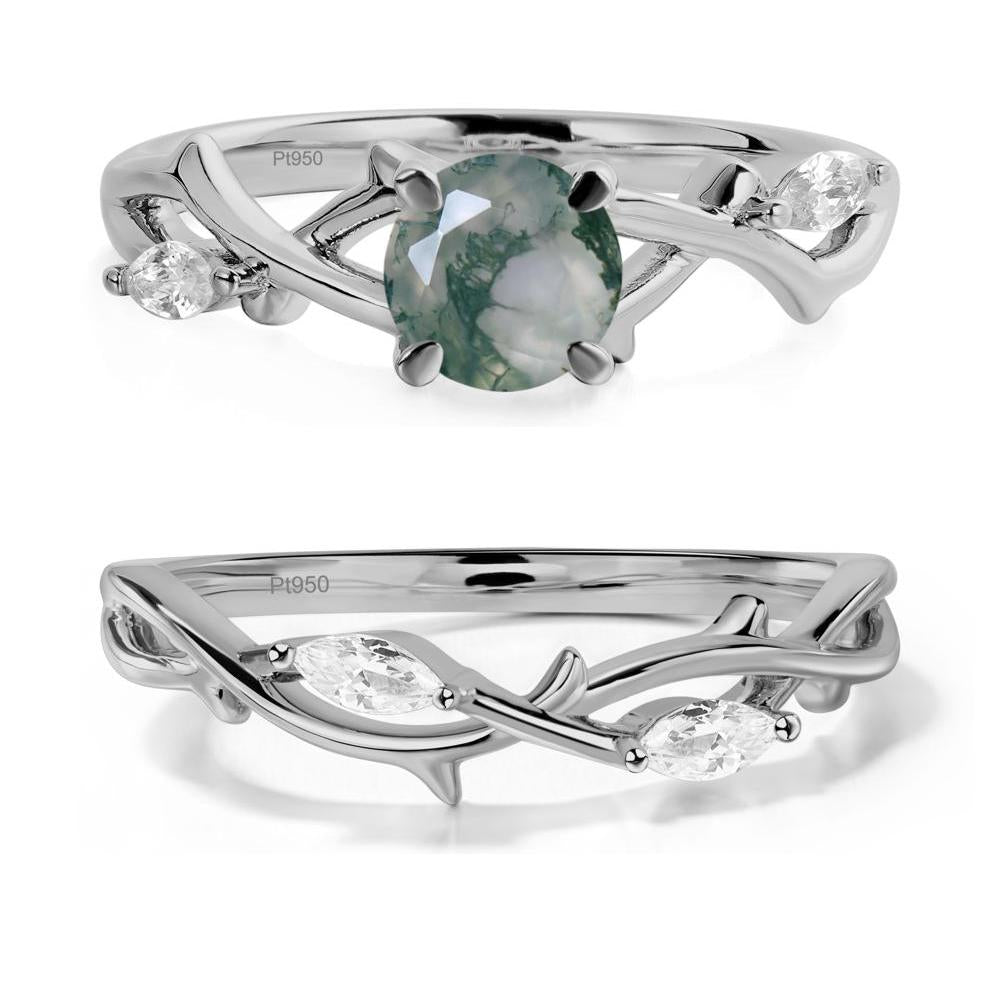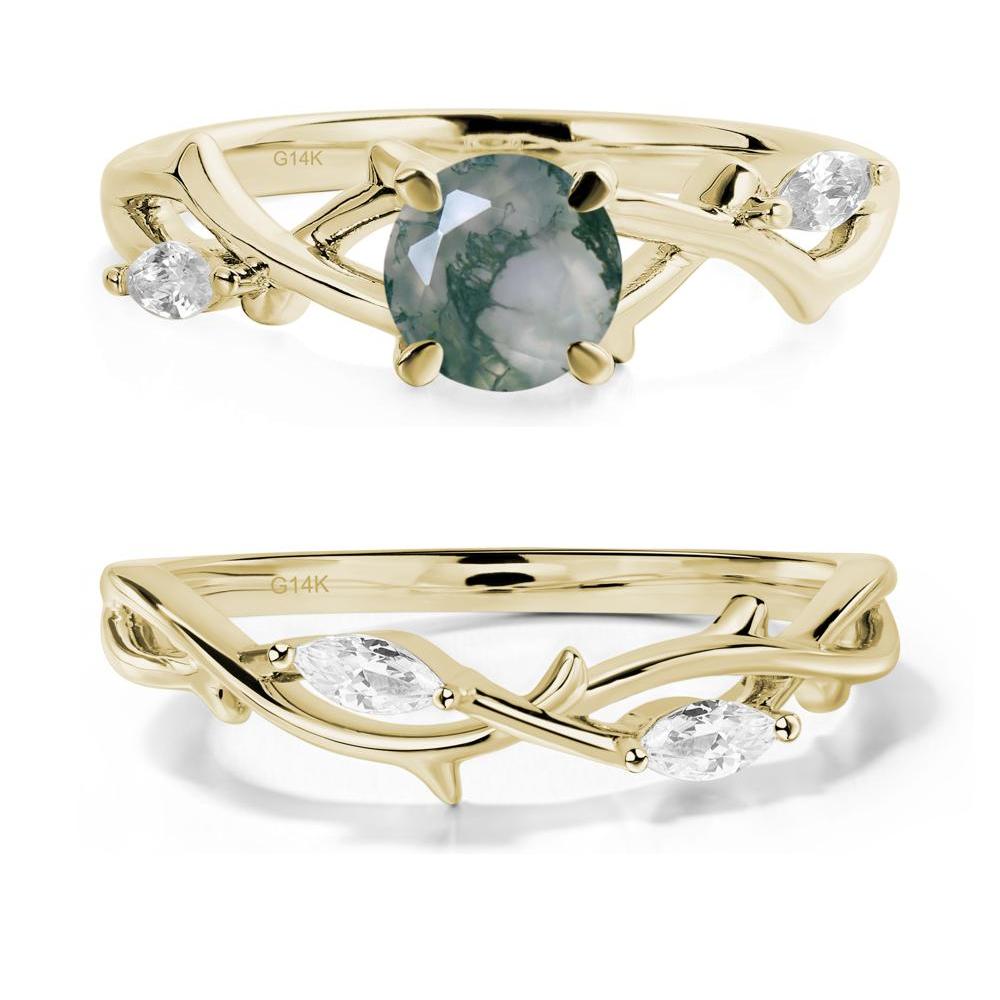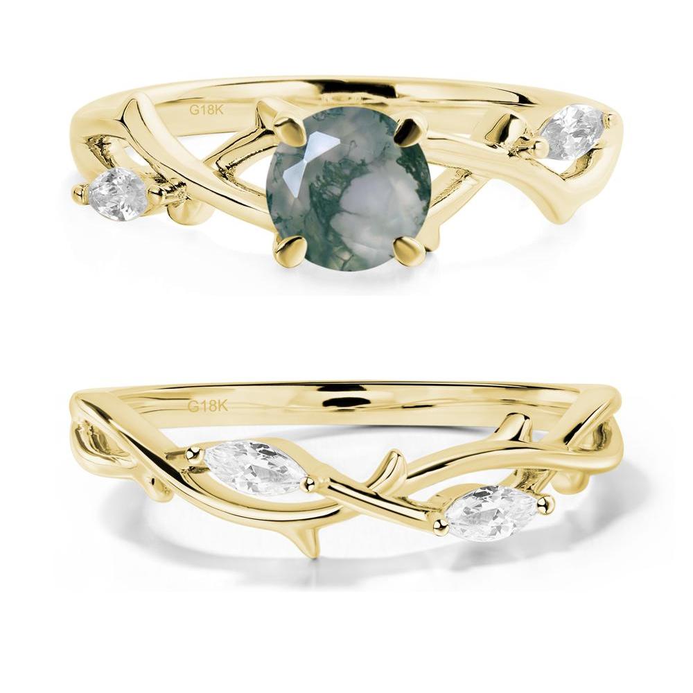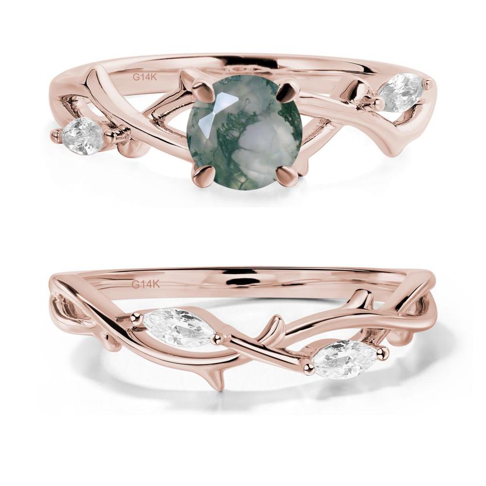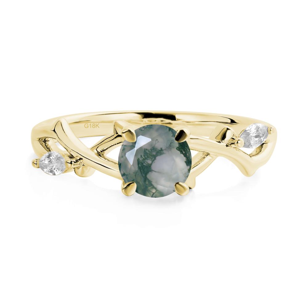 This moss agate ring's style is organically inspired, with a band that mimics the gentle curves of a twig, accented by buds on its winding path.