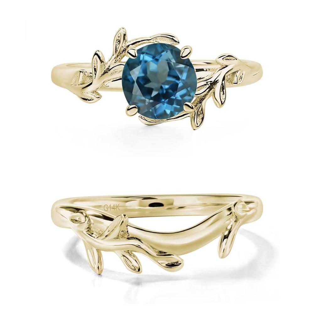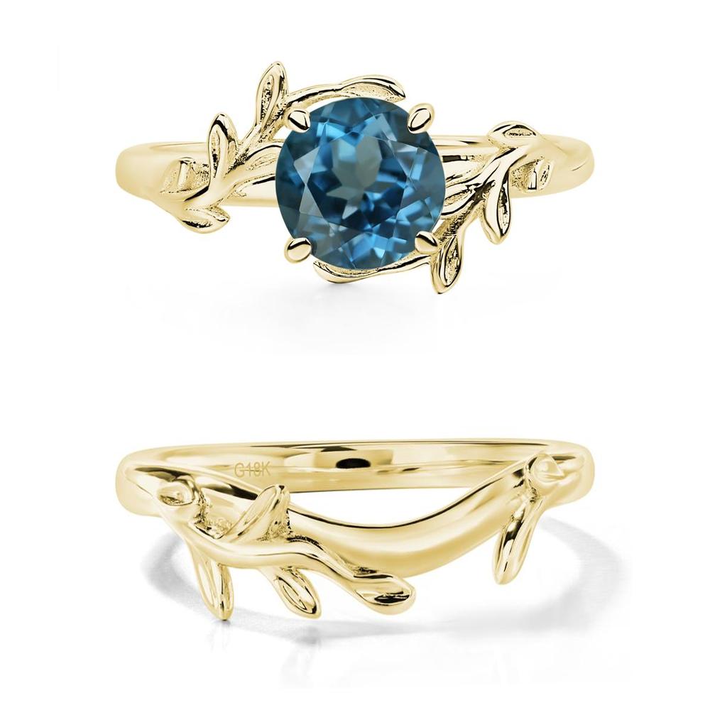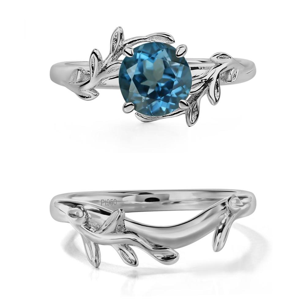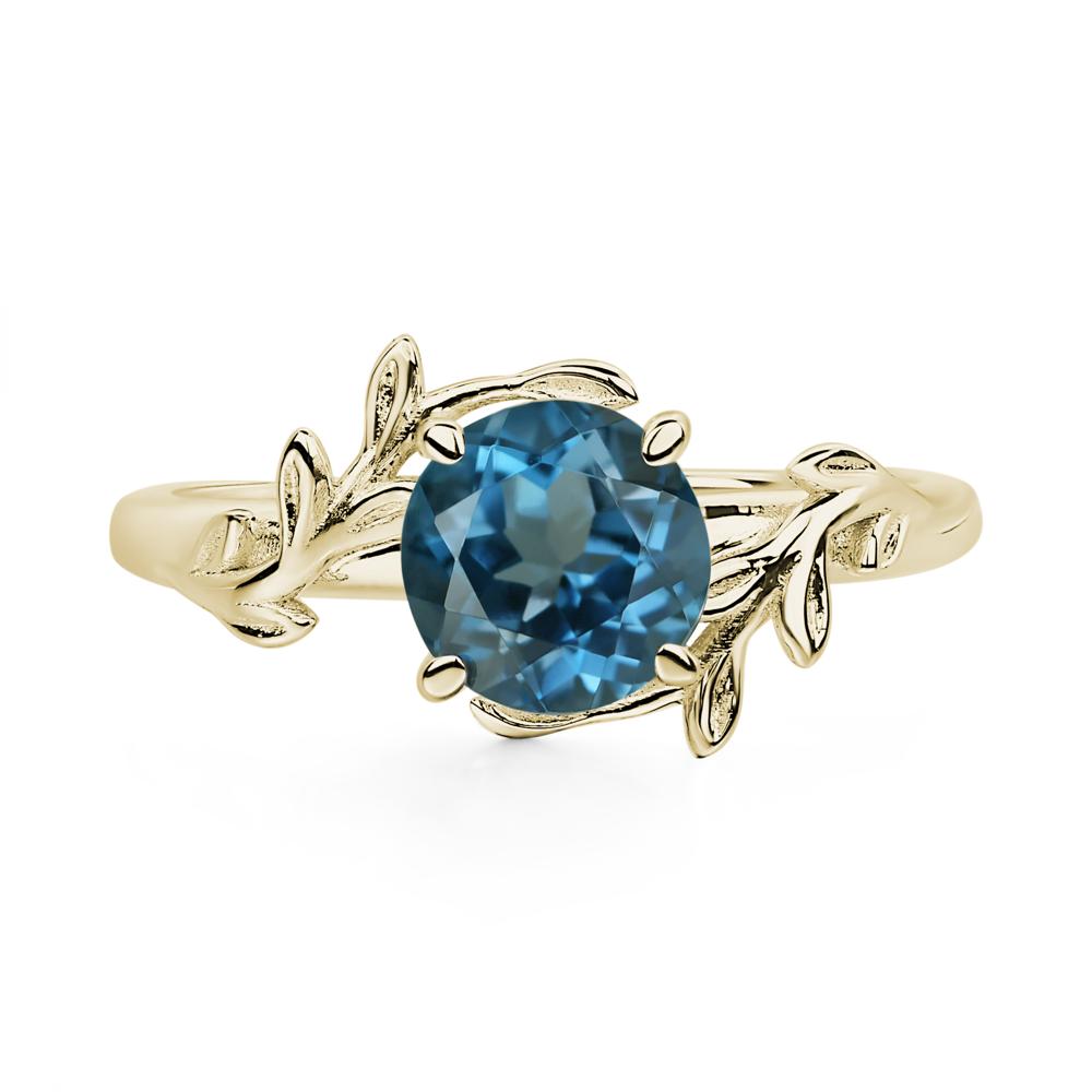 This ring is adorned with an elegant leaf and vine motif, gracefully wrapping around a circular cut london blue topaz, echoing the charming essence of a wildflower garland.