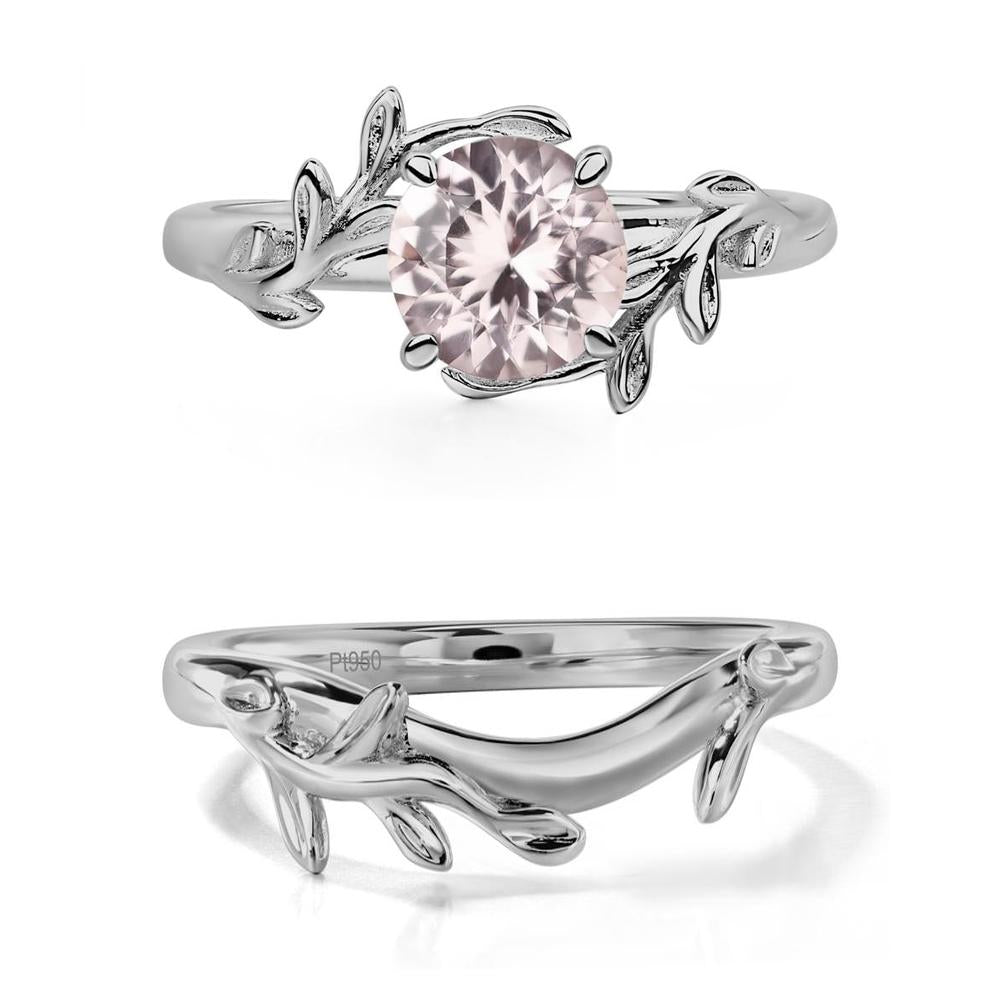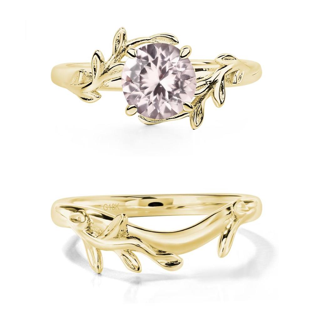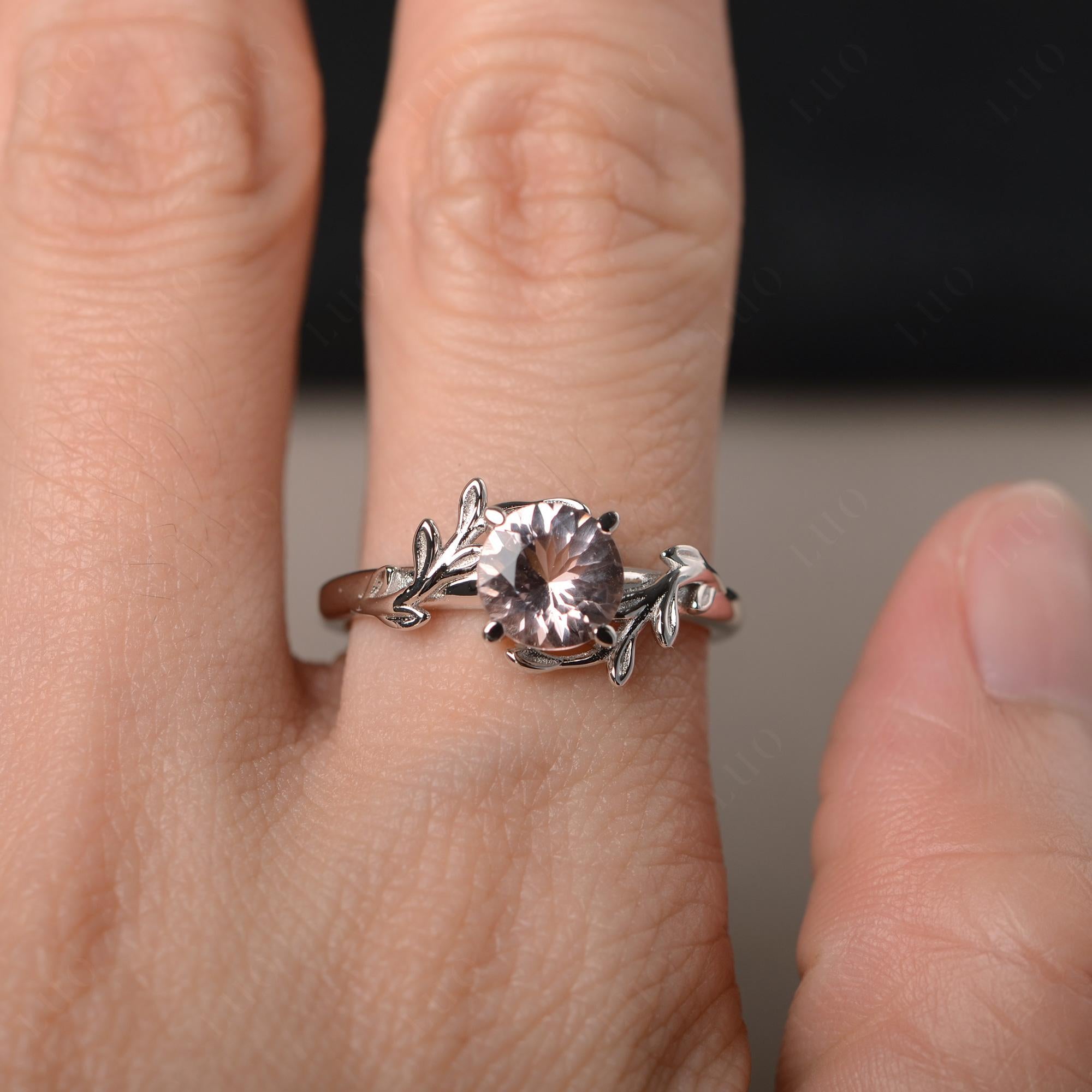 This ring is adorned with an elegant leaf and vine motif, gracefully wrapping around a circular cut morganite, echoing the charming essence of a wildflower garland.