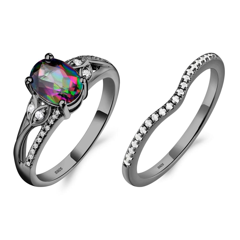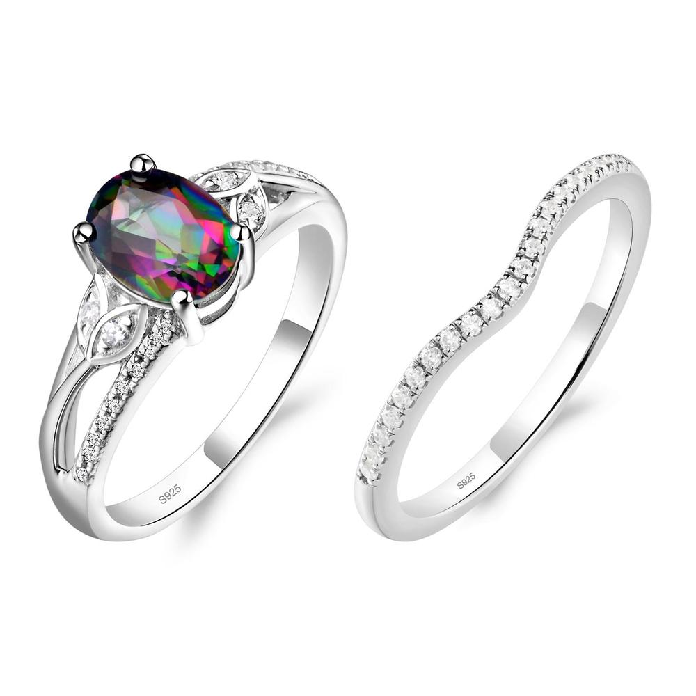 このオーバルカットのミスティック トパーズ リングは、CZ スタッズ付きの葉の間に魅惑的なミスティック トパーズがあしらわれており、時代を超えたデザインで自然の優雅さを彷彿とさせます。