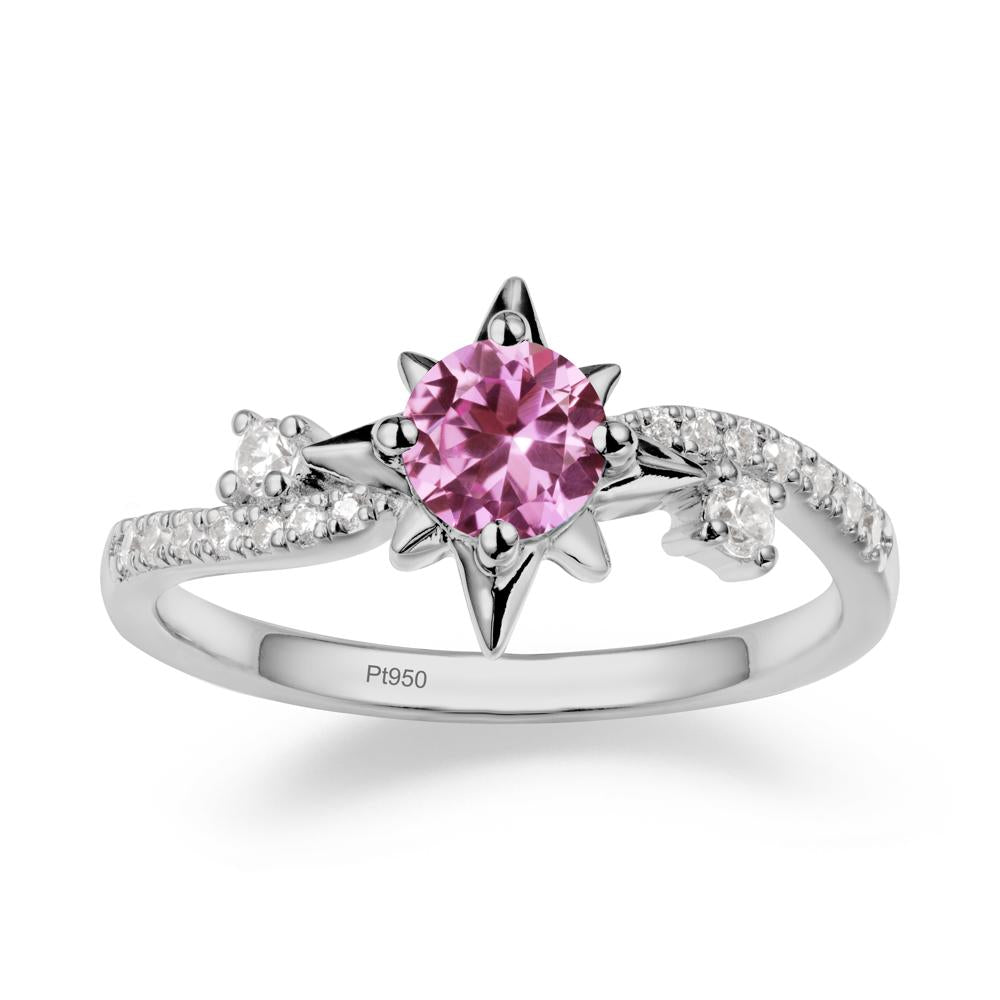 This pink sapphire ring features an octagonal star in the center, set with a round pink sapphire and surrounded by side stones. Inspired by the star, this ring combines the mystical beauty of the celestial body with the exquisite charm of the star pattern, making it a unique symbol of protection and good luck.