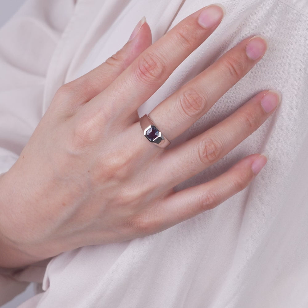 This ring presents a simple design with an Asscher-cut lab alexandrite nestled in a bezel setting, atop a wide, smooth wide band, offering a fusion of geometric elegance and contemporary.