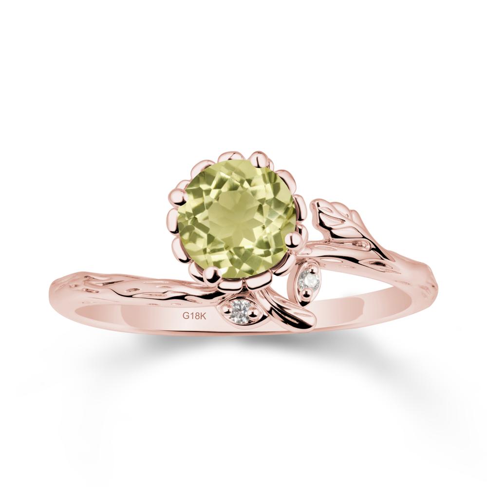 This ring features a round lemon quartz surrounded by delicate leaf ornamentation, set in a textured woodgrain textured band. Inspired by nature, the elegant florals give this piece a unique and whimsical quality, making it an ideal choice for those who appreciate a natural style.