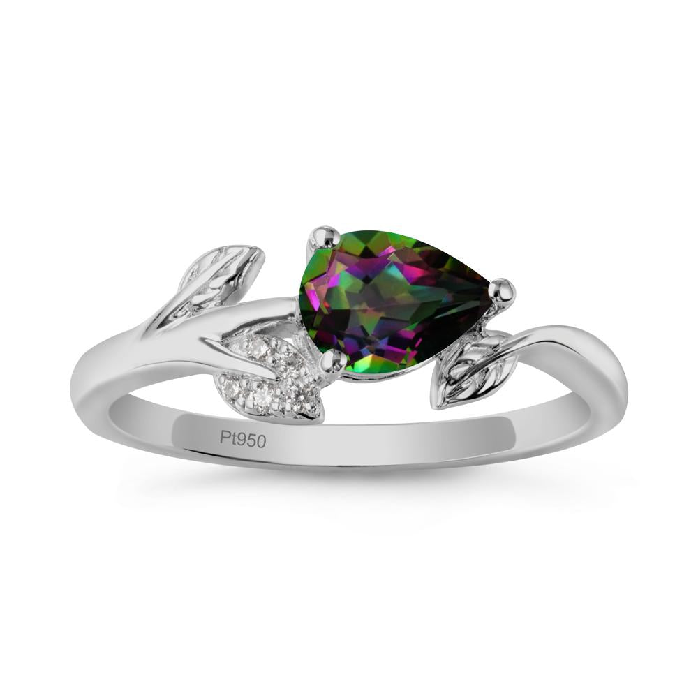 Spring is in the air! This exquisite green leaf ring features a pear mystic topaz. The pear shaped mystic topaz center stone, paired with graceful, flowing branches and leaves, emphasizes life, hope, and the beauty of nature.