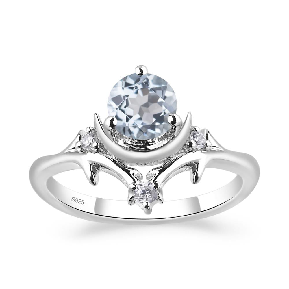 This ring artfully integrates a crescent element, embracing a prominent central aquamarine with its curved form, complemented by a cascade of orbs and fluid bands for an ethereal, moon-inspired motif.