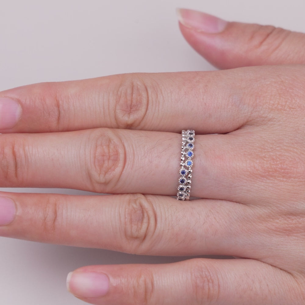This lab sapphire eternity ring showcases a harmonious blend of scalloped settings and milgrain embellishments, surrounding each gemstone with intricate detail. It's designed for those who treasure vintage aesthetics and want a piece that speaks to everlasting elegance and grace.